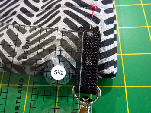 - The bottom folded edge of the tab should be ¾” above the seam line of the top hem. The left side edge of the tab should sit ½” from the left side seam of the bag. When pinned in position, this means that the swivel hook itself should sit about ½” above the top folded edge of the bag.