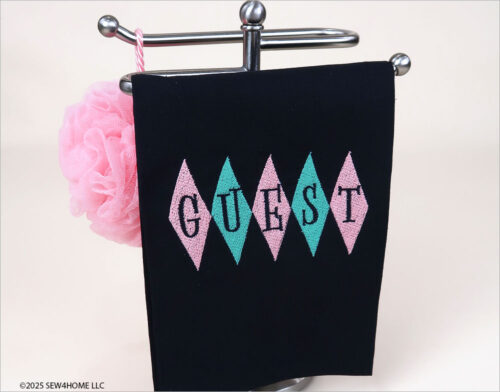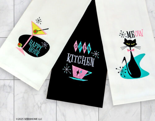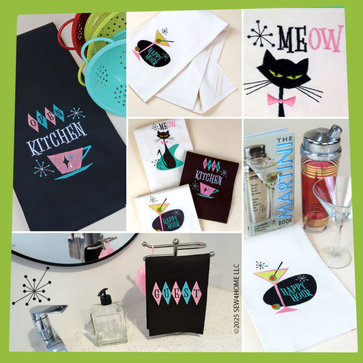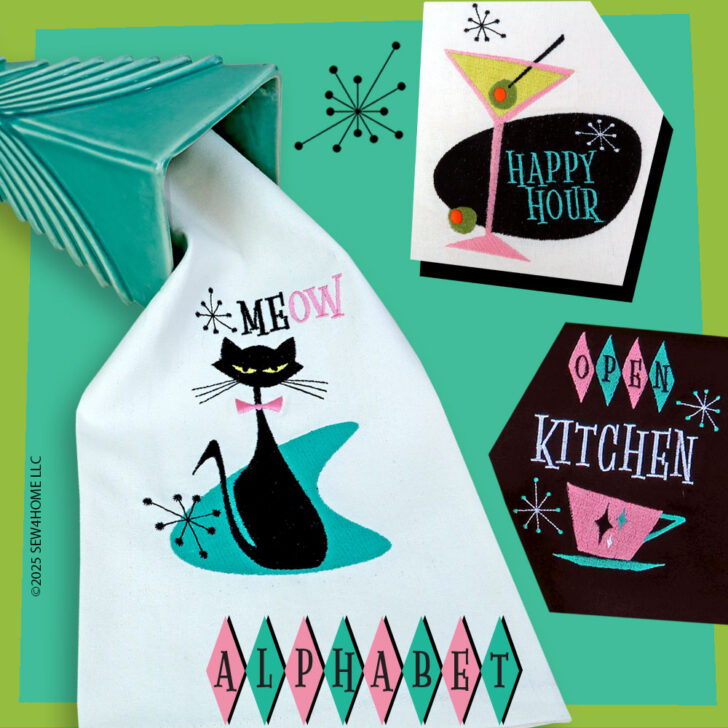 There are three complete designs celebrating: Happy Hour, an Open Kitchen, and the stylized Black Cat. In addition, there are individual Atomic Particle Starbursts, the full alphabet we used, and a bonus set of background diamonds to build your own lettering banners, as shown on our Guest towel.
