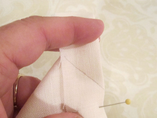 - Fold the hems right sides together, creating a point at the corner. The two outer ends of the original drawn line (the folded edges) should align back to back. Pin in place.