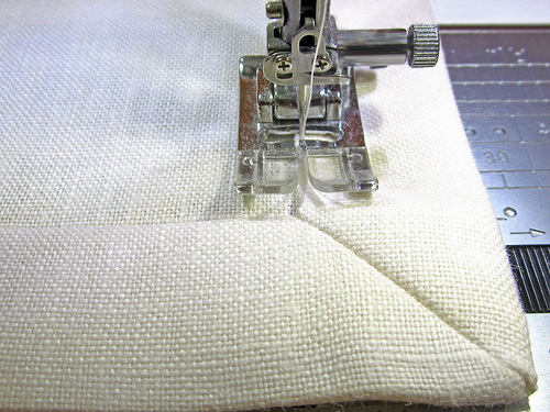 - Repeat these steps at each corner. When all four corners are complete, re-press the double hem and edgestitch in place, staying close to the inner fold and pivoting sharply at each corner.