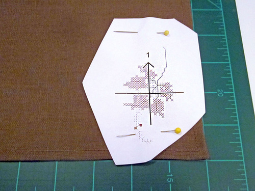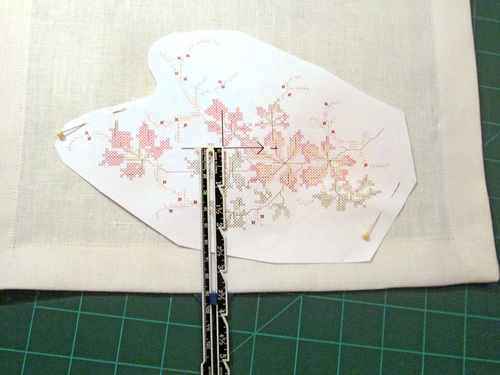 - Cut away the excess paper from the Main Autumn Leaves Garland Design template. Position the template on the pre-hemmed placemat. Make sure the placemat is facing right side up. We placed our Garland 3½” in from one side, centering the design top to bottom. The crosshair should be parallel with the edges of the placemat. Mark the center of the crosshair with a pin.