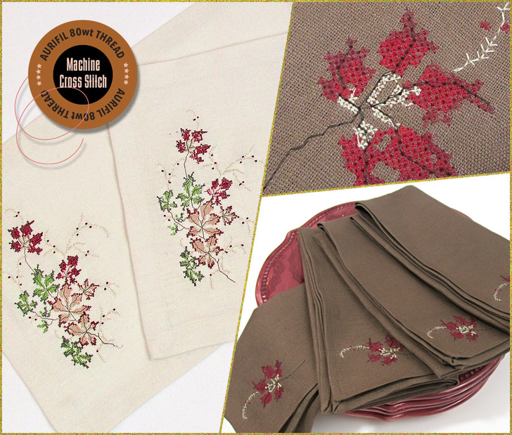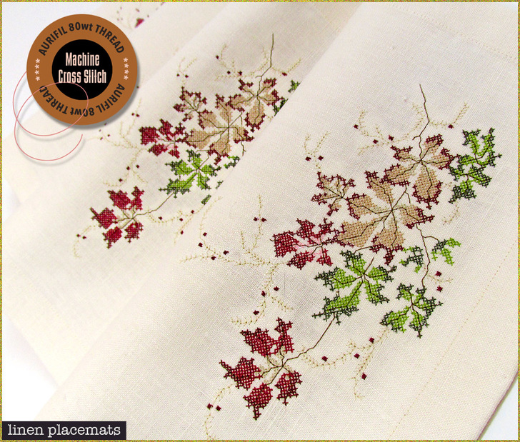 Our placemats finish at approximately 19¾” wide x 12½” high. The napkins are 18” x 18” when flat. The Main Autumn Leaves Garland Design is about 5” x 8” when fully stitched and the Autumn Leaves Detail finishes at about 1½” x 3”.