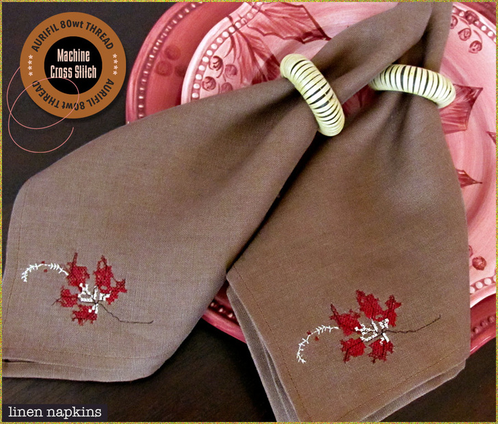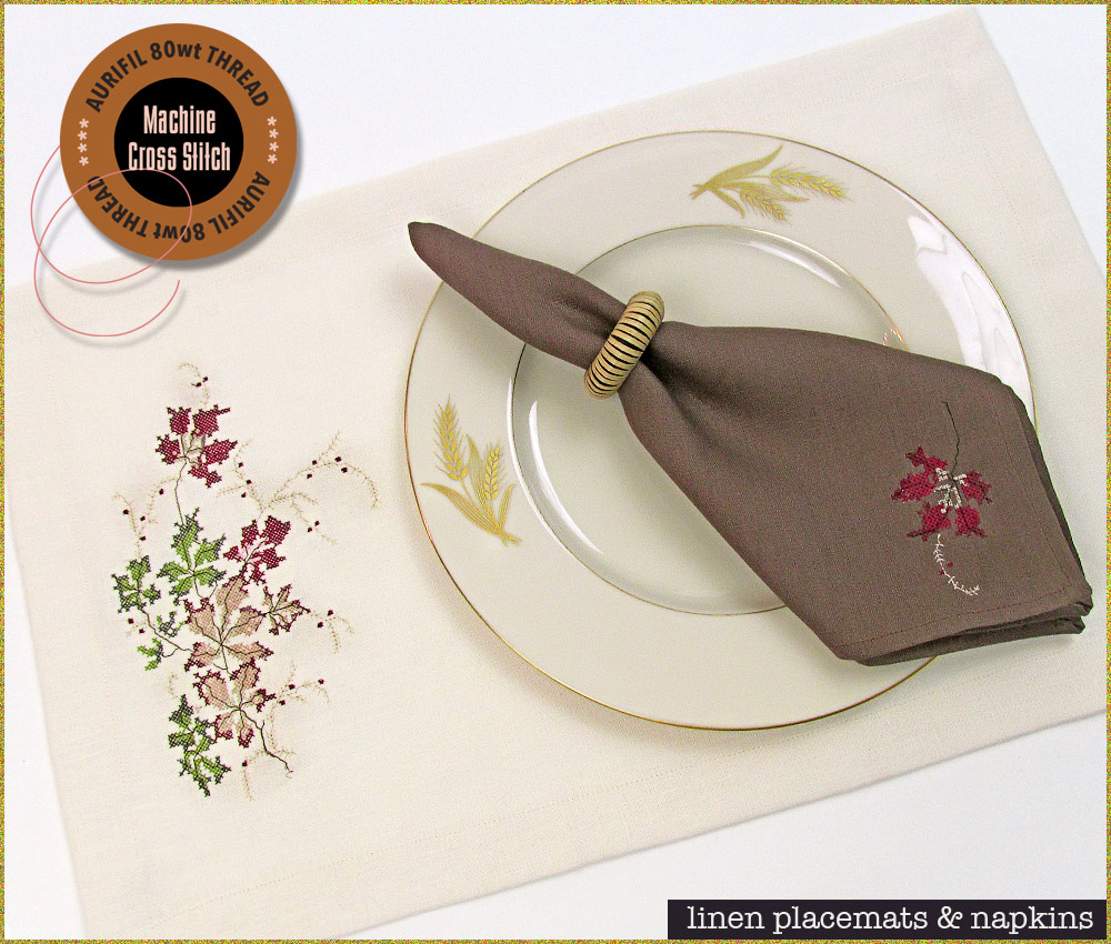 We stitched our designs on a set of luxurious linen placemats and napkins. The larger design would also be lovely at either end of a table runner.