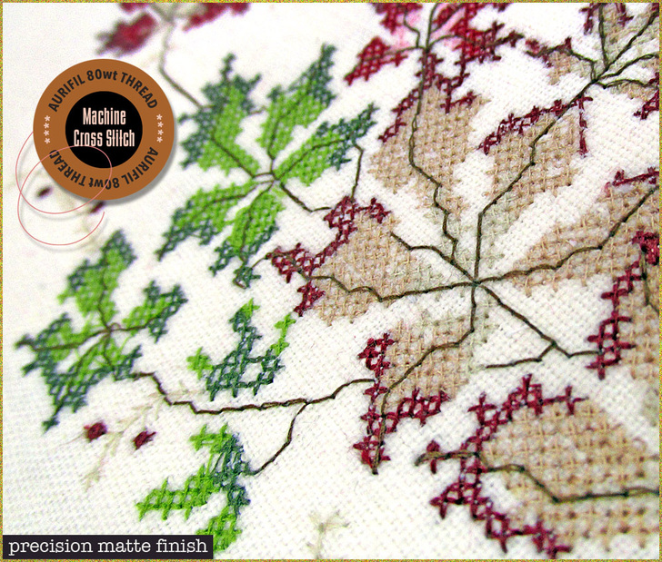Cross Stitch is one of the oldest styles of embroidery. According to several historians, it dates back as far as the Tang dynasty in China (618-906 AD). It is traditionally done by hand with hundreds to thousands of tiny cross-hatches forming each finished design. In many ways, it’s really a precursor to today’s pixelated digital designs. To create cross stitch by machine, you need a thread with a matte finish to replicate the traditional antique look, and it must be super fine in order to form the multitude of tiny crosses. We chose Aurifil 80wt thread, which succeeded beautifully on all levels, producing a soft, realistic heirloom finish.