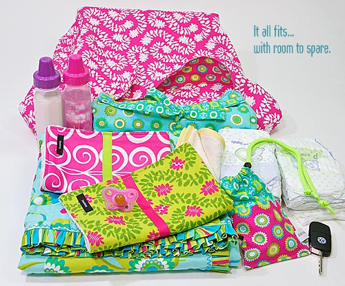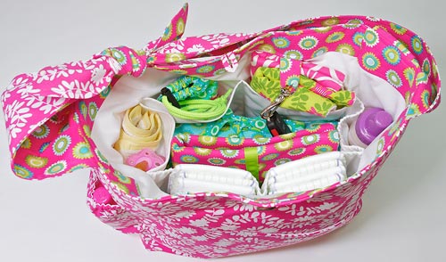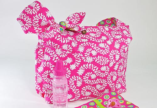 Our smaller (and cuter) diaper bag isn’t meant to supplant the full-size, workhorse of a diaper bag; you know the one I mean… the one that holds enough stuff to open your own nursery school. Nope. This one is perfect to grab and go for short jaunts out and about. It’s still big enough, with pockets inside and outside, to hold the essentials: several diapers, wipes, a couple bottles, a special blankie or toy, even your own wallet and keys. The outside fabric is a designer cotton; the inside is the popular PUL waterproof fabric.