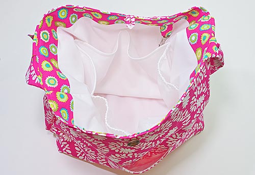 PUL (Polyurethane Laminate) fabric can be a little finicky to work with, but is a great option when you want a thin, lightweight waterproof layer. It’s very popular with folks who make their own diaper covers. These same people caution against the use of pins as they poke unnecessary holes into the PUL and reduce its effectiveness as a waterproof fabric. They suggest fabric clips, paper clips or basting tape. I totally get this for a diaper cover, which you really do want as leakproof as possible, but for our bag, we did use pins. Our construction is much more complex than a diaper cover, and there are points where matching is essential and so, therefore, are pins. Your lining will still be plenty water-resistant to protect against splashes and small spills, as well as to protect against the wet items that inevitably get tossed in.