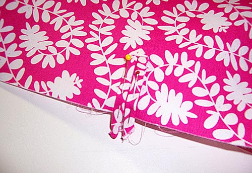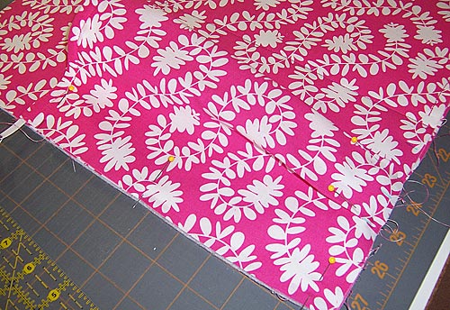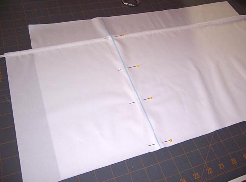 - Pin in place along the short end up to the casing and along the bottom back toward the marked vertical stitch-line.