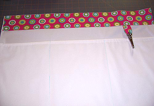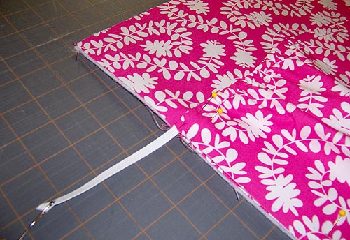 - Align the marked vertical pocket lines on both pieces and pin in place. Stitch along these marked lines, back stitching across the elastic. Trim the ends of the elastic.