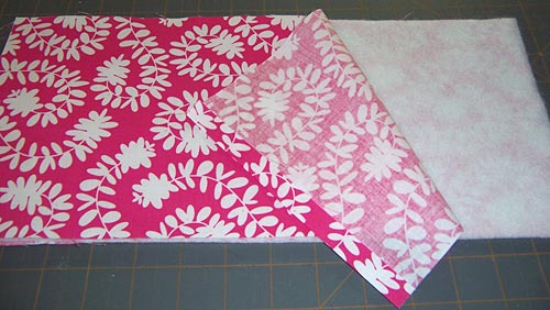 - Place the outside bottom panel with the fusible fleece wrong side up on your work surface. Fold under one short end of the remaining fabric bottom panel ½” and press. Place this fabric panel over the fleece, right side up. Align the remaining raw edges of the top panel with the bottom panel. Baste the two panels together along the three raw edges. The short side with the folded edge should not be basted.