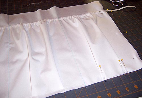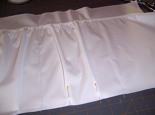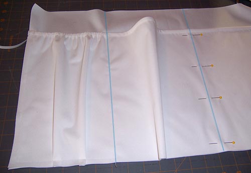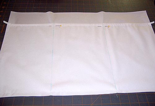 - Turn right sides out. Press. Topstitch ¼” from the edge. Form pleats by folding on the marked lines and basting in place.
