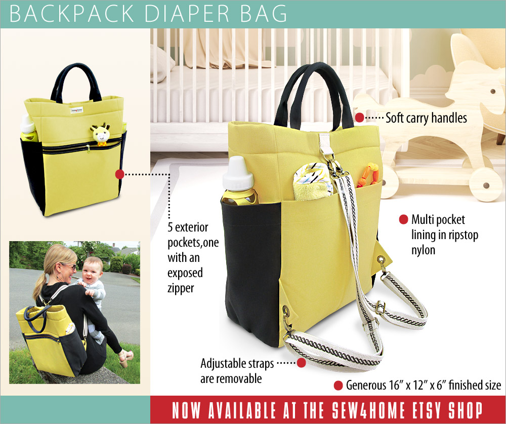 This great out-and-about bag is a brand new pattern available in our Etsy Shop. You know how busy little ones can be; so it makes sense to free up your hands with a diaper bag that can also be worn as a backpack! Originally released as part of the exclusive Sew4Home Maker’s Club, this popular pattern is now available for purchase by all our Sew4Home fans and followers.
