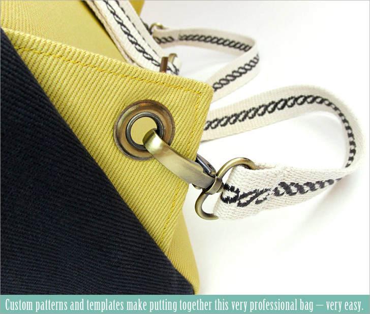 The pattern’s instructions include complete steps on how to create adjustable webbing straps with decorative stitching accents, an inset base, corded handles, an exposed zipper pocket, and a ripstop lining with both flat and elastic pockets.