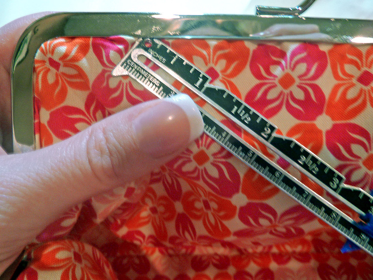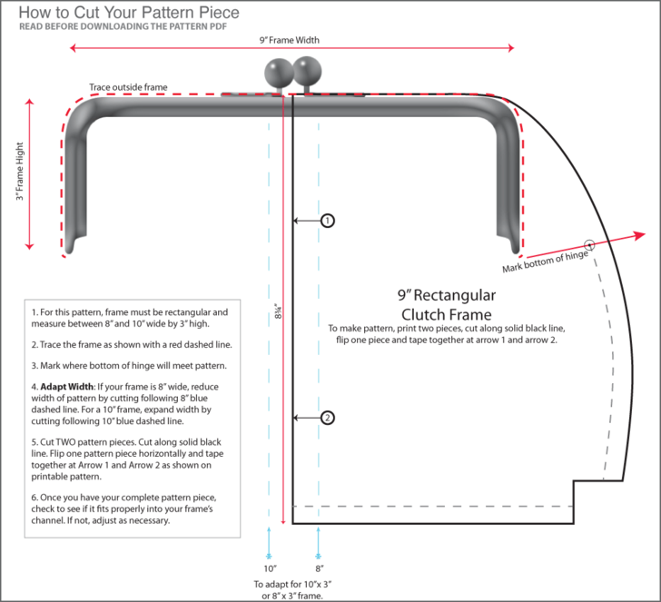 We link to our source for the ball frame below, but spotted many other options from which to choose in local craft stores as well as online; Etsy sellers have a particularly large selection of purse accessories. We also show you how to slightly adjust our pattern (designed for 8″-10″ wide x 3″ high) to fit your frame.