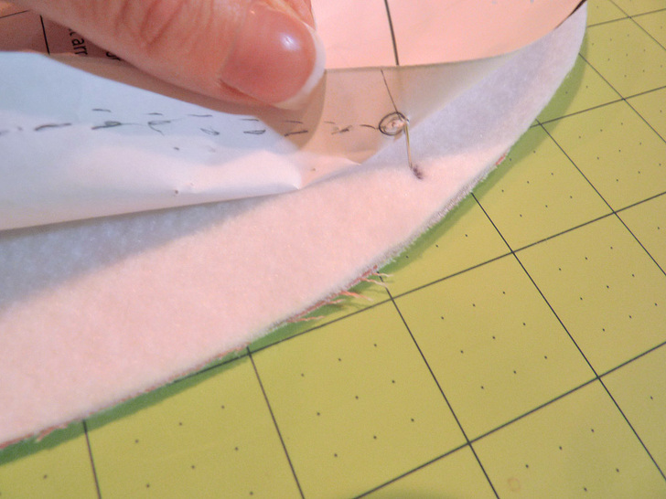 - Place the pattern piece onto the wrong side of both layered exterior pieces (on top of the fleece) and transfer the side marking dots. Make sure you transfer the dots on both sides of both pieces.