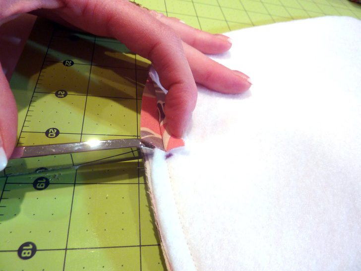 - At each bottom corner, pull the notch apart to create a peak, matching the side seam to the bottom seam.