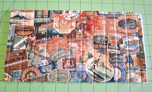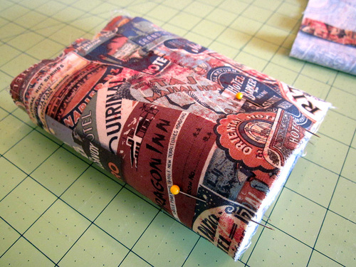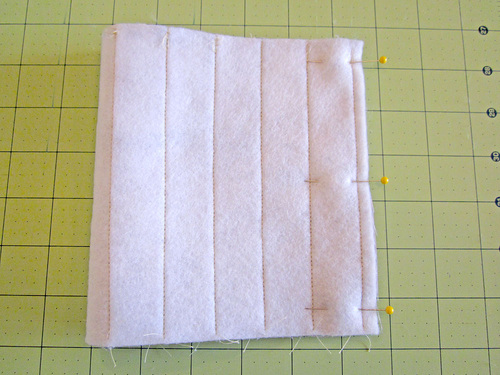 - Fold the quilted exterior in half, matching the raw sides. Pin in place.