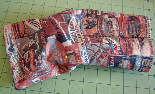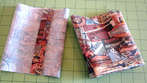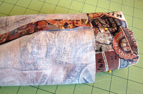 - Match up the sleeve to the exterior. The two pieces should be wrong sides together and the bottom folded edges should be flush. Adjust the ½” folds if needed to insure the bottom edge is perfectly flush and the cover will sit flat. Pin in place all around the bottom.