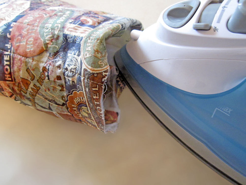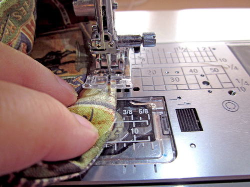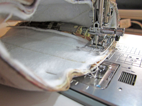- Edgestitch in place around the entire bottom through all the layers. The lining should still be pulled out in the opposite direction so it will not get caught in this seam.