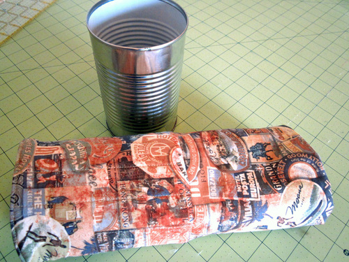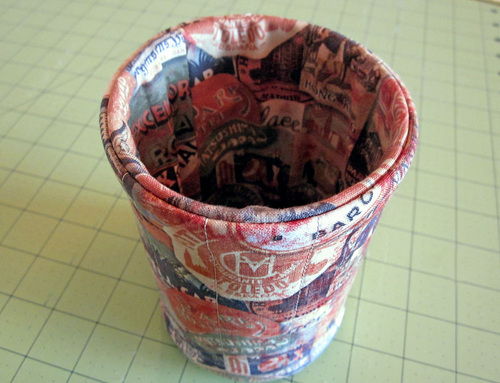 - Slip the quilted exterior/sleeve portion of the tube over the can. Then, push the lining down into place inside the can. Your cup is now fully finished inside and out!