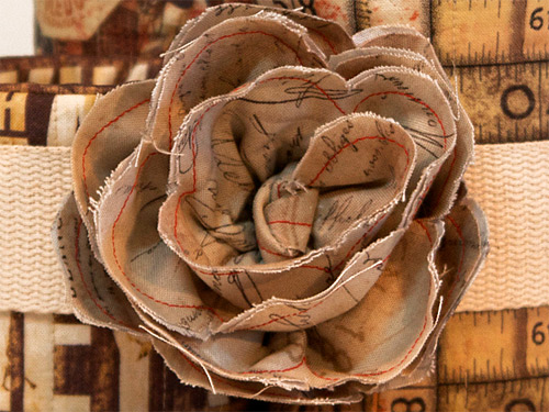 - Complete using the Fabric Flower tutorial featured as a Guest Tutorial by Paula Cheney, originally of Tim Holtz’s creative team. We made just two changes from the original steps: 1) we reduced the starting size from 5″ x 44″ to the 3½” x 36″ size specified above so our petals would be just 2″ in width, and 2) we eliminated the dowel as a “stem.” Instead, we simply rolled the flower on itself rather than around the dowel. We used the contrasting red thread as our accent topstitching.