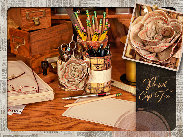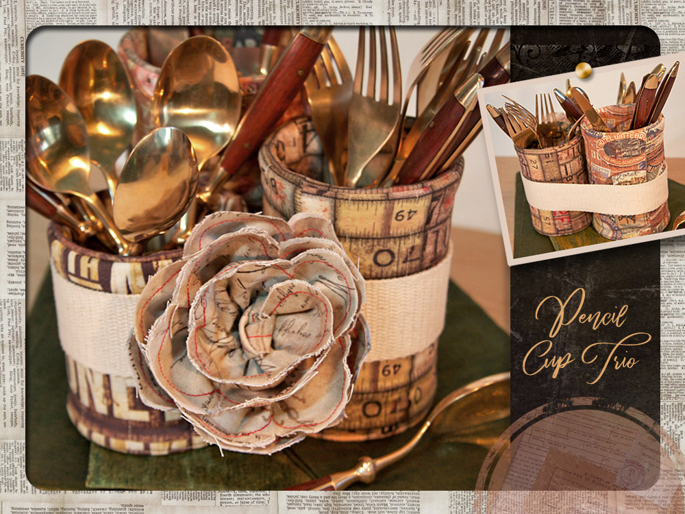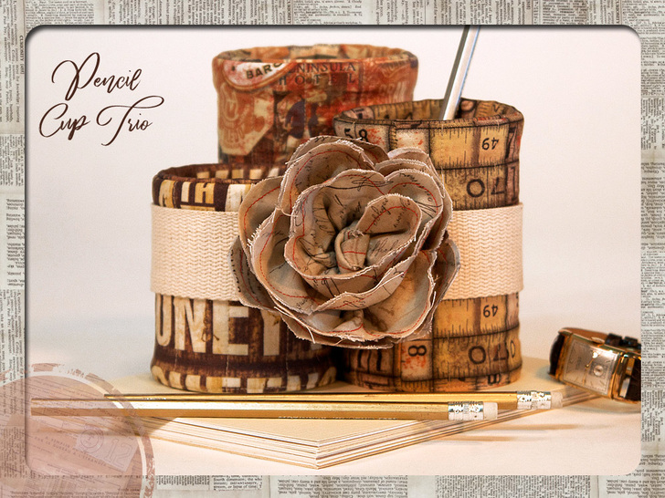Over the years, the constant on my desk has been the pencil cup my oldest daughter made for me in preschool from a soup can and construction paper. I’ll never get rid of it, or the My Little Pony® pencil that came with it. Over the years, I have added some more elegant versions by its side, like this banded trio of pencil cups in three sizes. We selected the vintage designs of the Eclectic Elements fabric collection by Tim Holtz – a good choice since pencils and pens themselves seem to have become part of the vintage world in today’s device-driven environment.