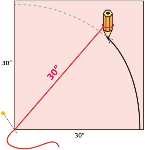 - Cut a piece of string 32″ long. Pin one end to the 90˚ corner of your two drawn lines. Tie the other end to a pencil. Make sure after you’ve tied the string to the pencil that the string measures 30″ from corner to pencil point. In essence, you’ve just made a little compass. You are so smart!