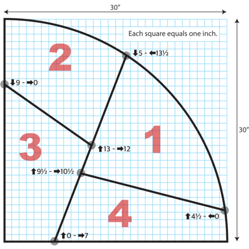 - Follow our grid pattern below to mark the corner points for each of the four pattern pieces. The numbers next to each point indicate how many 1″ squares UP/DOWN and how many 1″ squares over to count to reach the point.