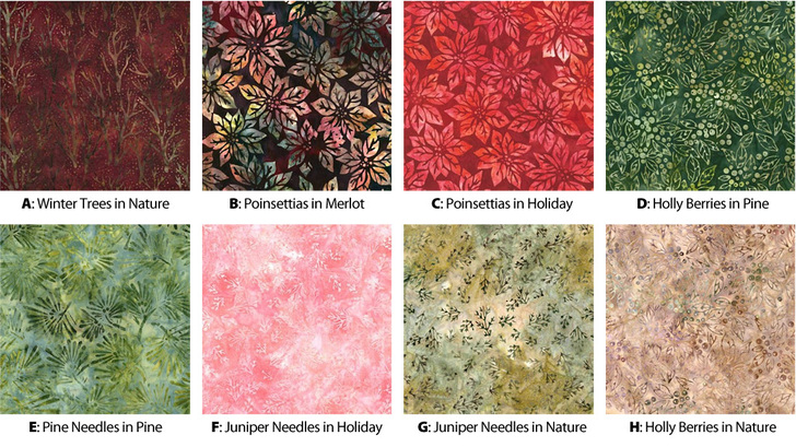 We selected on eight different fabrics to create our patchwork, originally pulling from the Northwoods 5 Artisan Batiks by Robert Kaufman. This collection has been supplanted by newer collections and is no longer readily available. But as mentioned above, new options are released each year.