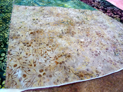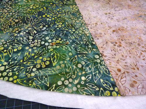 - Center the skirt top/batting on the backing. Re-pin the safety pins through all three layers.