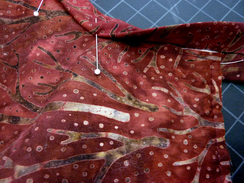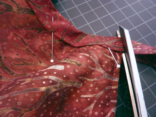 - Fold each buttonhole tab over the binding to the opposite side of the opening. With the tab in place and laying flat, mark with a pin through the center of the buttonhole for the button position.