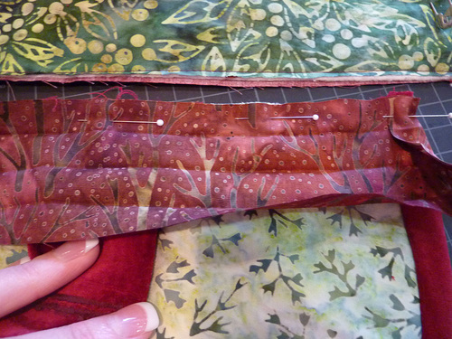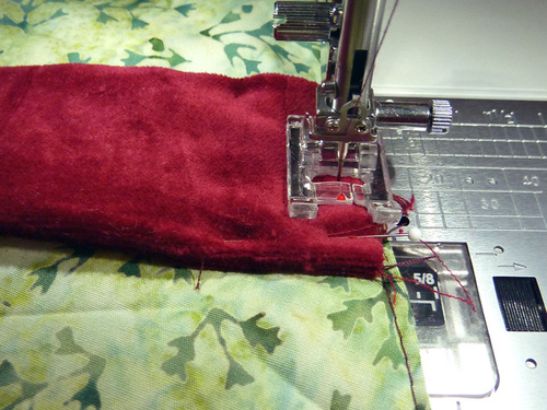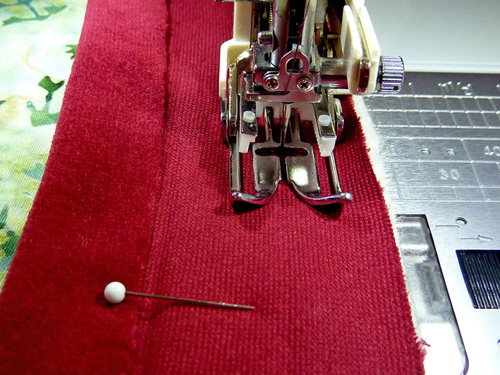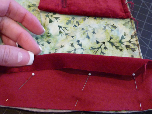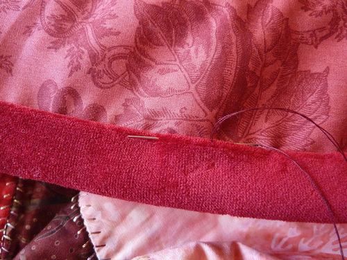 - As with the velvet binding, fold up and over to the back and pin in place, making sure the fold at the back covers the seam line. Since the fabric is much thinner, this final binding you can stitch in place by machine. Edgestitch along the front, catching the back in the same seam.