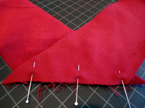 - Pin the tabs in place along the left raw edge of the opening slit. The first tab should be 4″ down from the quadrant seam, the second tab should be 14″ down from the seam, and the third tab should be 24″ down from the seam. Align the raw edges of the tab with the raw edges of the opening slit.