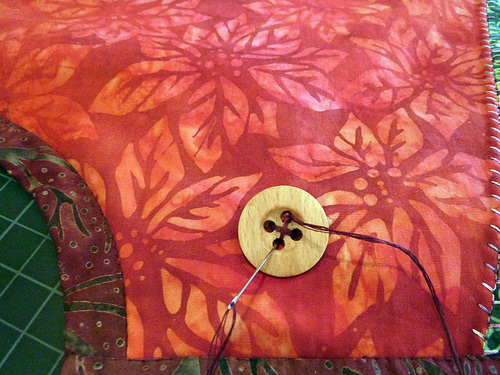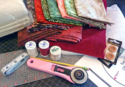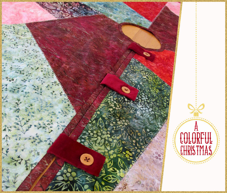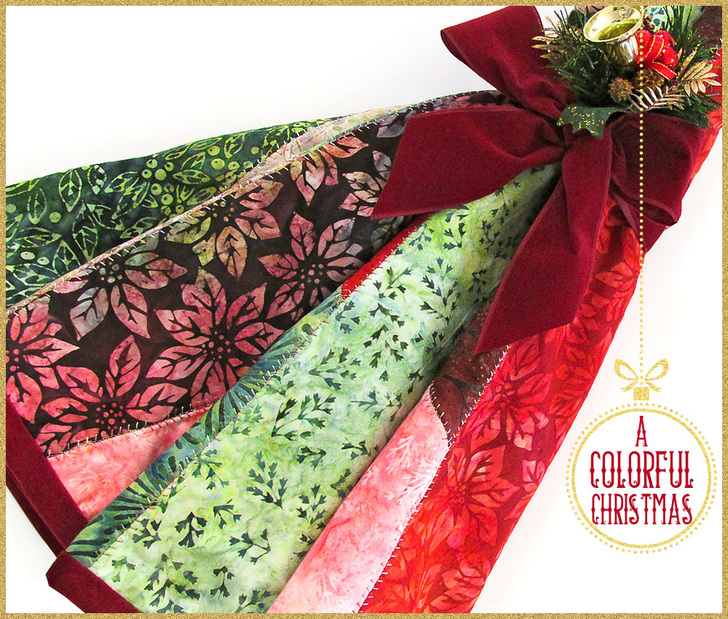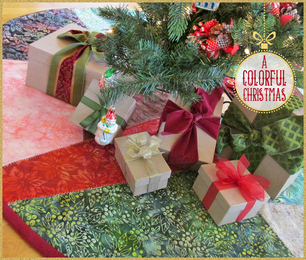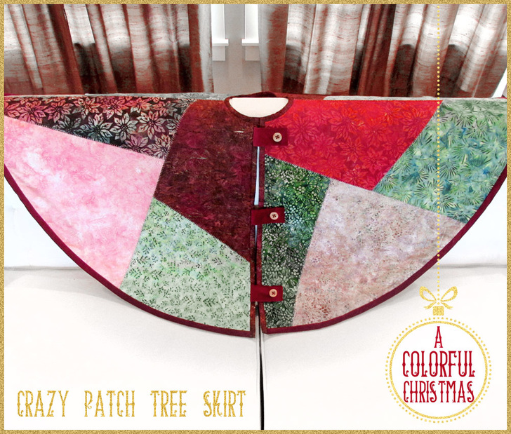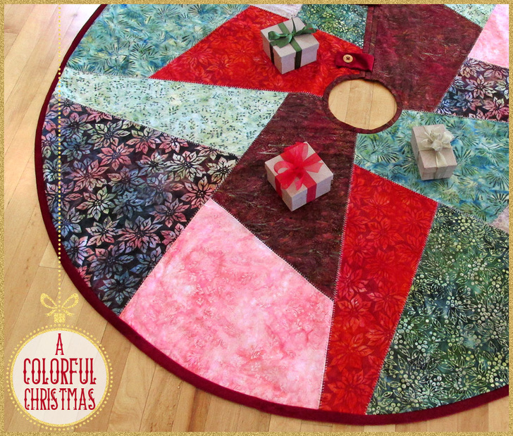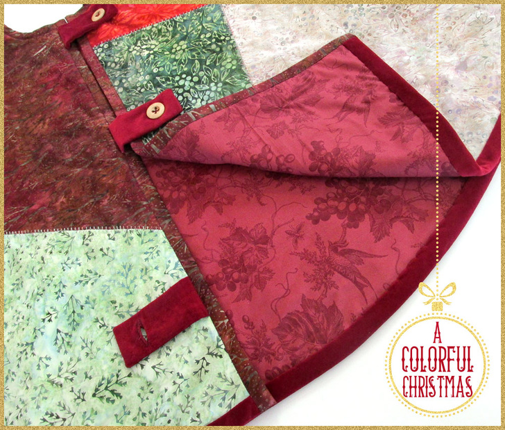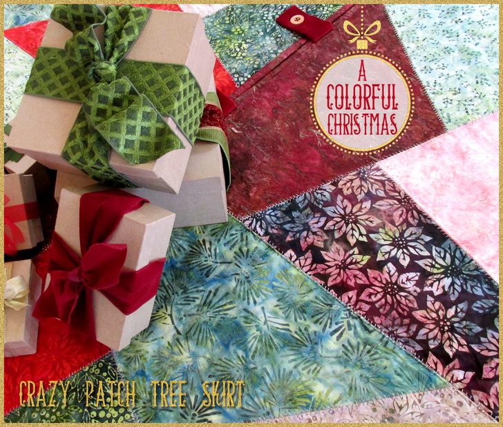 Holiday themed batik quilting cottons have become a very popular seasonal fabric. A number of manufacturers are now coming out with special collections each year. The motifs are a bit larger and the colors a bit bolder than what you might traditionally expect in a batik. It’s a fun and festive look, and was the perfect choice for the crazy patch treatment on our luxurious tree skirt. This is an easy project – there’s still time to whip one up for this year!