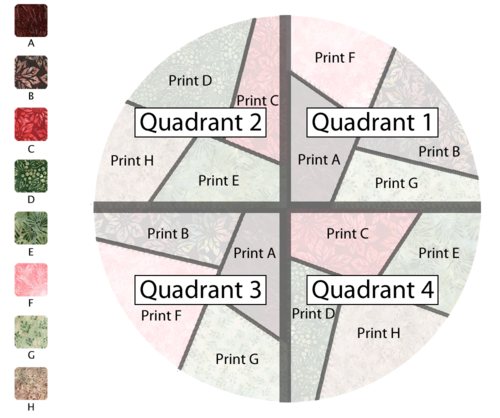 - Repeat to create Quadrant 4, using the following: Piece #1 in Fabric H, Piece #2 in Fabric E, Piece #3 in Fabric C, and Piece #4 in Fabric D.