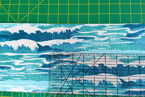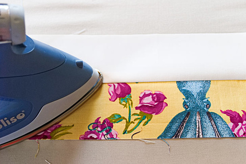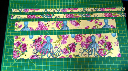 NOTE: When fussy cutting this fabric, we worked to center the octopus to its best advantage for the width of each strip, focusing on his head and body on the wider panels and on his tentacles on the narrow straps.