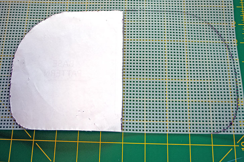- Using the trimmed base panel (the version used for the fusible fleece). Trace one half onto the plastic canvas with the pattern right side up. Then flip the pattern at the center line and trace the other half with the pattern wrong side up to get the complete base outline. Cut along the outline with craft scissors.
