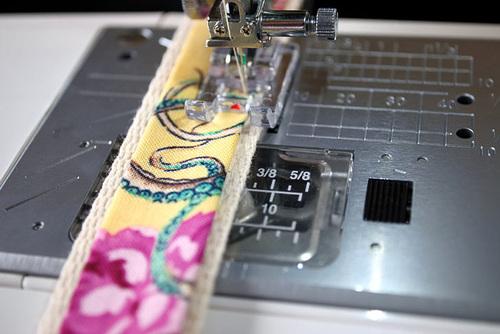 - Thread the machine with thread to best match the fabric in the top (we used pale yellow) and thread to best match the webbing in the bobbin (we used natural). Lengthen the stitch.