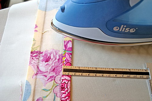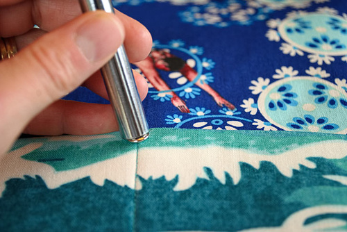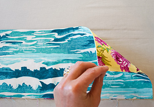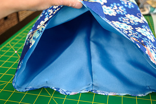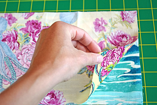- Turn right side out through the open end. Gently push out the corners so they are nice and sharp. A long blunt tool, such as a chopstick, knitting needle or point turner works well for this. Fold in the raw edges of the open end so they are flush with the sewn seam. Press flat.