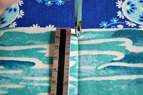 - From the fabric for the exterior pocket panel (Oceanus in Aqua in our sample), fussy cut ONE 31” wide x 7” high rectangle.