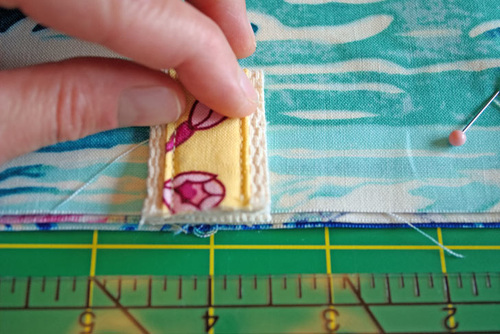 - Stitch vertically through all the layers, securing the overlap and creating two open channels to either side of the center seam.