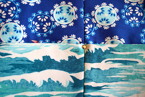 We love all the clever fussy cutting we were able to do with our original Neptune and the Mermaid fabrics. Front and center is the vintage diver plunging into the ocean waves of the pocket panel. A bit more hidden, but nonetheless clever, are lining panels with their hints of a sly octopus. Although this pretty collection, originally by Margot Elena of Tokyo Milk for FreeSpirit Fabrics, is no longer readily available at retail, you can shop for your own favorite options in bold colors and patterns that are begging for a fussy cut.