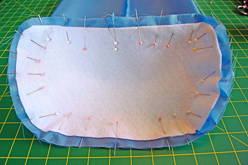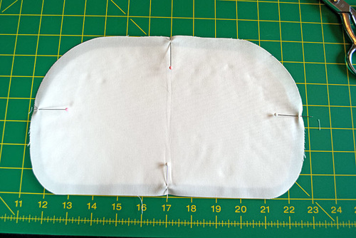 - Fold the fused base panel in half vertically to find the center of the front and back edges. Remember, the back edge is the straighter portion of the oval. Place a pin at each center point.