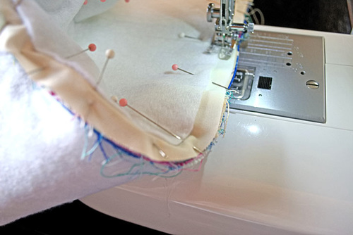 - Using a ½” seam allowance, stitch all the way around the base. Go slowly, holding the layers flat with your fingers if necessary to avoid any puckers, especially around the curves.