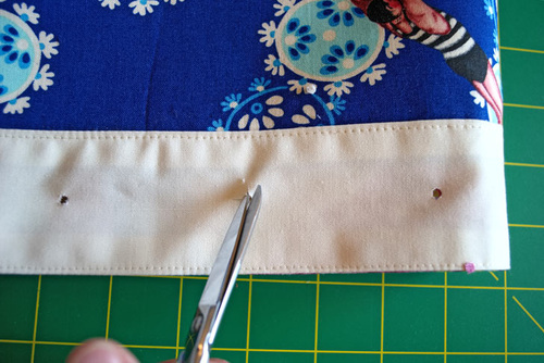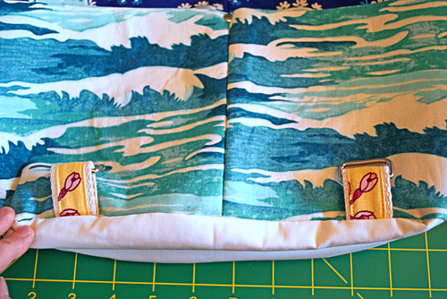 - Find the exterior and lining grommet panels. Place them right sides together. Make sure the lining’s motif (the noble octopus in our sample) is right side up.