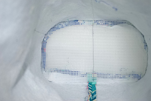 - Find the plastic canvas panel. Push it down into the exterior bag, fitting the plastic against the fleece.