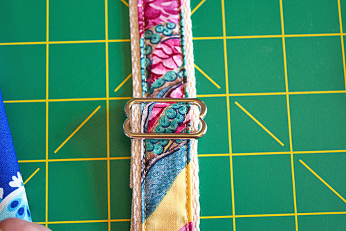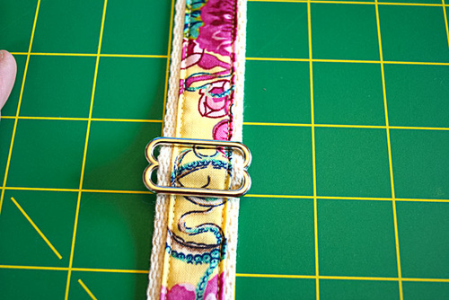 - Flatten the strap again. The bottom has been fed through the rectangle ring and is secured to create the adjusting loop. The top end of the strap is still raw.