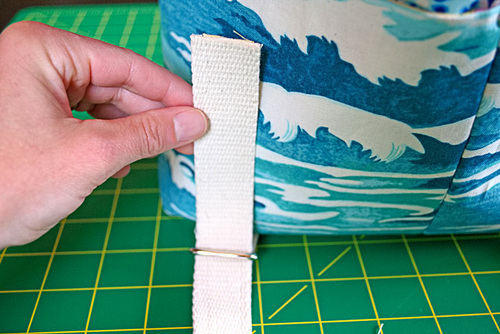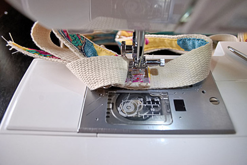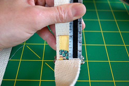 - With both straps in place, secure their top raw ends at the top of the bag. These ends should be centered to either side of the back seam with 3” in between the inner edges of the webbing.