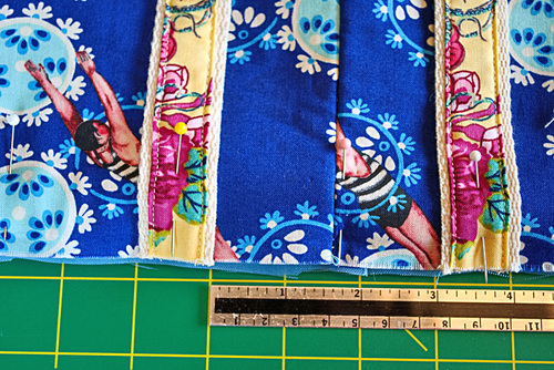 - Pin a tab 3½” in from each raw side edge of the assembled exterior panel.
