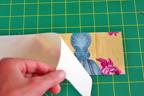 - Place the interfacing panel on the wrong side of the exterior pocket panel. There should be ½” of fabric showing beyond the interfacing on all four sides. Following manufacturer’s instructions, fuse in place.