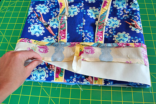 - Once you’ve gone around with the grommet panel flat, fold the lining down into position at the inside of the bag. The folded edge of the lining should cover the inner seam allowance. Press flat all around once more.
